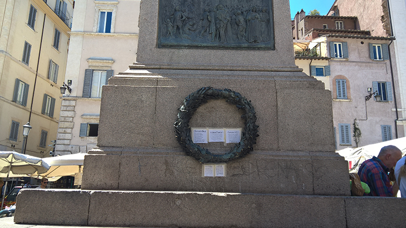 Bem, falta a foto da parte do monumento onde está a estátua do homem, não sei onde está essa foto ou sequer se ficou registada no telemóvel, mas podem ver o monumento na totalidade aqui, e relativamente a este momento em homenagem a Giordano Bruno, achei absolutamente fascinante a sua história e vou partilhar aqui convosco: nascido Filippo Bruno em Nola, no Reino de Nápoles em 1548, foi um teólogo, filósofo, escritor, matemático, poeta, teórico de cosmologia, ocultista hermético e frade dominicano italiano, condenado à morte na fogueira pela Inquisição romana (Congregação da Sacra, Romana e Universal Inquisição do Santo Ofício) acusado de heresia por defender argumentos que considerava serem erros teológicos. É também referido em documentos históricos pelo nome Bruno de Nola ou Nolano.